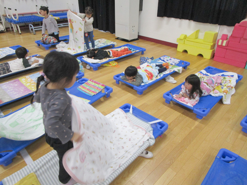 こんにちは!発表会の取り組みも始まり、各クラスでは一生懸命頑張っている子ども達。一気に気温が下がり肌寒い日が続いてますが、お昼寝をしてからは上着を着て元気いっぱいお外で遊んでいます☆お家から持ってくる子ども達のお昼寝用のタオルも、気温に合わせて薄いものから、暖かいモコモコのタオルに変わってきています☆