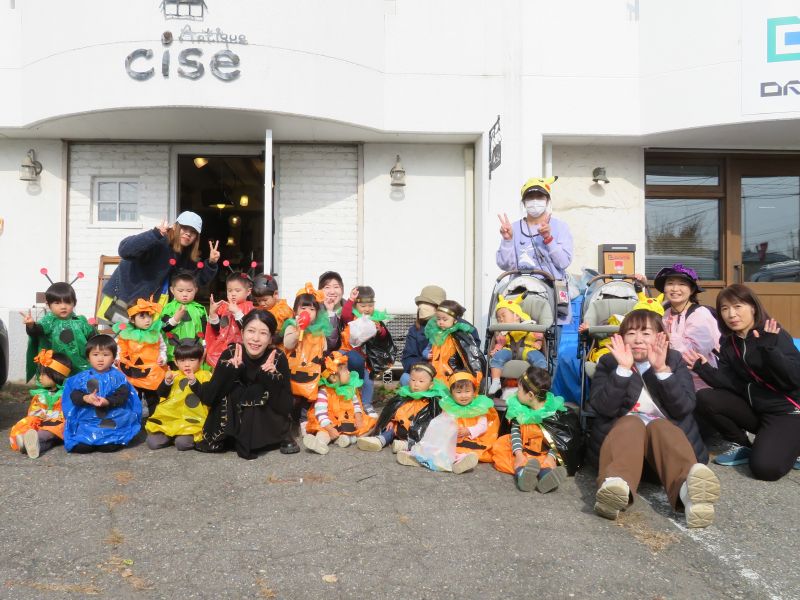 事前に依頼していた方々のお家やお店へ行き、「トリックオアトリート!」と大きな声で言ってお菓子を貰いました!お礼に「ハロウィンのうた」をプレゼントし、歌い盛り上がりました。沢山お菓子をもらい、子ども達はとっても嬉しそうでしたよ。