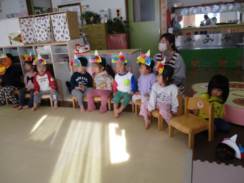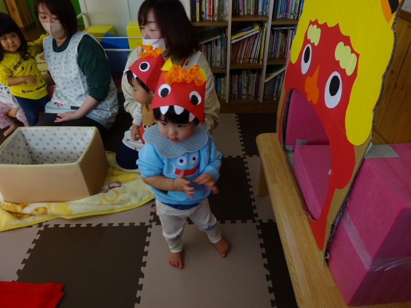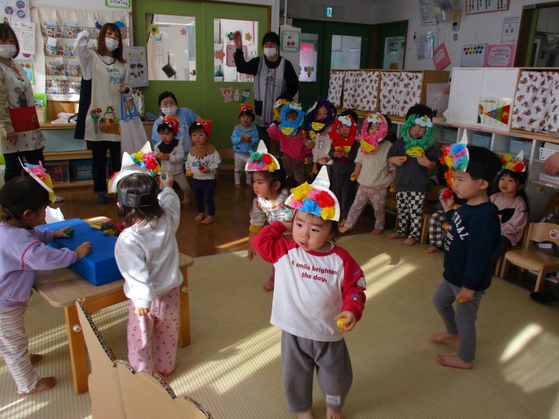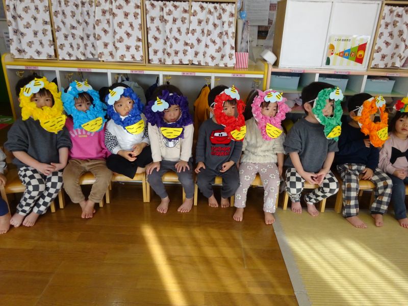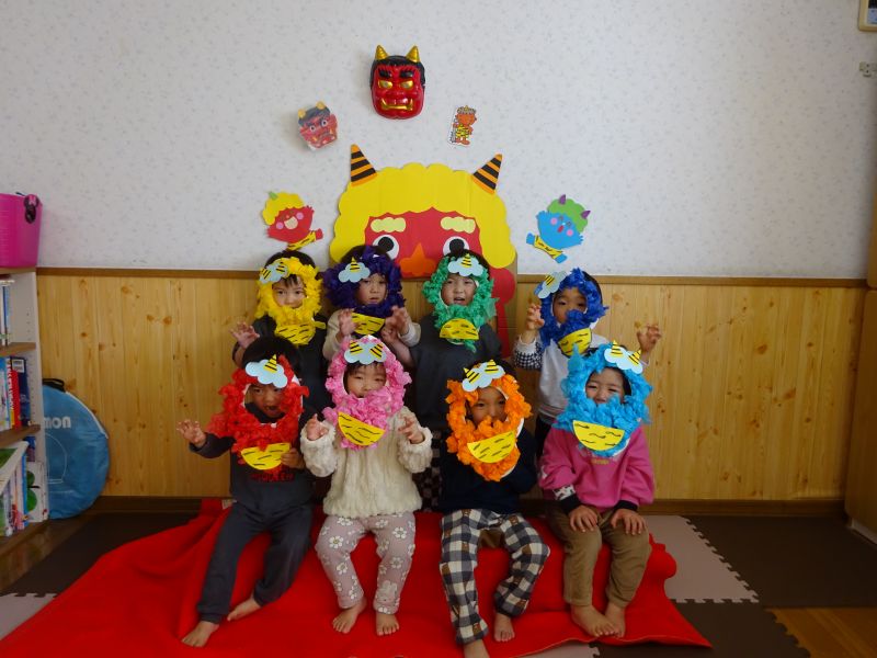 012青い鳥保育園では2月3日、毎年恒例の節分の日の行事を開催しました。節分のお話を聞き、まめまきの歌をうたっていると園長先生と一緒にちび鬼さんが登場!!ちび鬼さんは優しく太鼓を叩きながら、みんなに会いにきました。「泣き虫鬼はいないかな?」「おこりんぼ鬼はいないかな?」「イヤイヤ鬼はいないかな?」ちび鬼さんはみんなの心の中の悪いオニを探してくれました。悪い心の鬼を退治するために「おにはそと〜ふくはうち〜」と新聞紙豆を投げて、園児全員で悪いオニを退治しました。節分と言えば、「恵方巻き」保育士3人が本物のごはんとのりで恵方巻作りを披露しました。「今年は南南東を向いて最後までおしゃべりせず食べると願いごとが叶うよ」子どもたちも静かに真剣に見入ってくれました。{先生たちだけ食べてずるい〜}という空気感がちらほら・・・・次は、毛布シートに箱を乗せて子ども達を乗せ保育士が引っ張るゲームに参戦!大きな鬼のお口の中にカラーボールを投げました。乗っている子ども達はにこにこスマイル!大人たちは汗をかいて引っ張りましたよ。最期は年明けからずっと楽しんでいた鬼のダンス「鬼のまつり」をみんなで踊って無病息災を祈りましたよ!怖いオニが登場しなかったので、誰も泣かずに節分行事は無事終了しました。