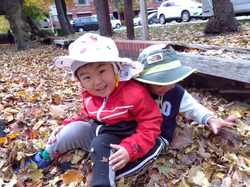 すっかり朝晩だけではなく日中も冷え込む日が増えてきましたが子ども達は寒さに負けず元気いっぱい遊んでいます!!道端に枯葉が沢山落ちていると全力でその上を歩きカサカサと音が鳴るのを楽しんだり、お友だちや先生を追いかけてみんなで落ち葉投げをして、全身落ち葉だらけで帰ることもしばしばあります!これからも身体を沢山動かしながら元気に過ごしたいと思います!