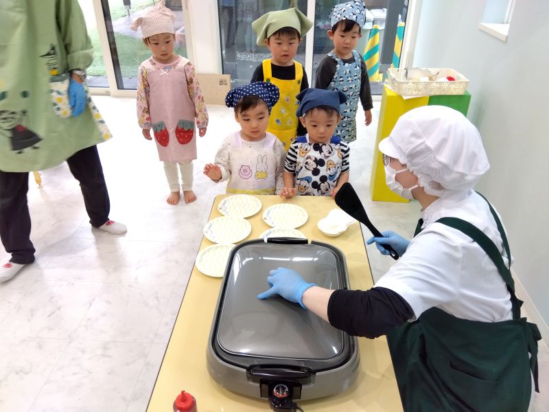 11月はじめには楽しみにしていたクッキング保育がありました。じゃがいもを使って「ハッシュドポテト」を作りました。色々な種類のじゃがいもを見て、皮や中の色の違いに驚く姿もありました。どの工程も真剣な表情で取り組み、完成すると…「美味しそう」と大喜び!!その日のおやつは「おかわりー」の声が止まらずモリモリ食べていました。たいこぐみの『食欲の秋』はまだまだ続きそうです!!