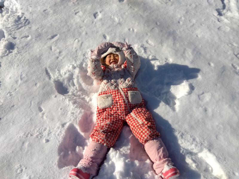 12月に入りすぐ子どものたちの大好きな雪が降り、早速つなぎを着て雪遊びをしました。最初は上手く立てないもどかしさと動きにくさに苦戦していましたが、2日目にはスタスタと歩けるようになり、時には自分で手袋を取り素手で雪を触ったり、氷を集めたり、投げてみたり雪遊びを満喫しているようです。