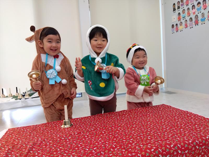 クリスマスチケットをスキャンしてもらい、参加証のメダルを首にかけスタート!!先生たちからのハンドベル演奏から始まり、子どもたちもベルを持ち、鳴らしてみました。大人と同じように鳴らしてみたり、柄の部分をツンツンと触ったり、中を覗いてみたりそれぞれの楽しみ方が見られました。