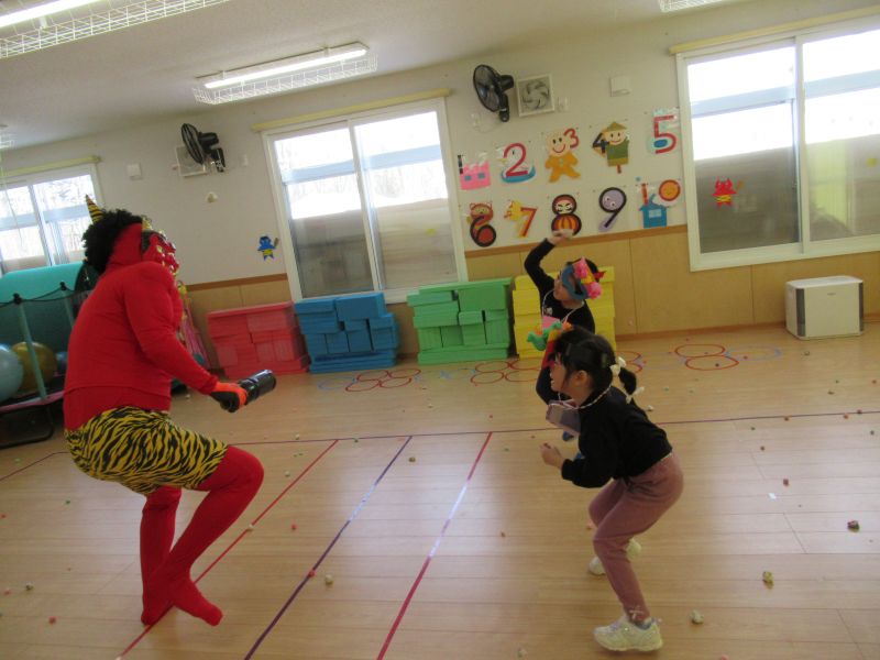 2/3(火)節分のまめまき行事がありました。自分で作った鬼のお面をつけてスタンバイ。鬼退治ゲームをしている時に迫力満点の鬼の登場にびっくり!怖がりつつも勇気を出して、鬼に立ち向かい果敢にせめて豆を投げ続けていた子どもたち。鬼退治頑張りましたよ。しっかりと心の中の鬼も追い出すことができたようです。きっと福の神がたくさん保育所に来てくれることでしょう。天気のいい日は、そり滑り・色水を使った雪遊びなど冬の遊びを楽しんでいます。外遊びはみんな大好きです。自然の中で、おもいきり体を動かし体力作りをしていますよ。雪解けまでまだまだたくさん楽しみたいと思います。