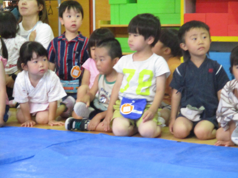 今月は、七夕、絵画指導、体育指導と楽しい事がたくさんありました。中でも七夕のゲームで行ったスイカ割りは、子どもたちの1番の思い出になりましたよ。目かくしには“かわいいサングラス”をかけてチャレンジ!年少さんはスイカに届いてもなかなか割れず…そんな時、年長さんがそっと手を添えてくれて、みんなで力を合わせて見事にスイカがパカッ!応援の声と笑い声が響く中、夏の楽しい思い出がまたひとつ増えました。まだまだ夏はここから!楽しい思い出をここからいっぱい作っていきたいと思います。