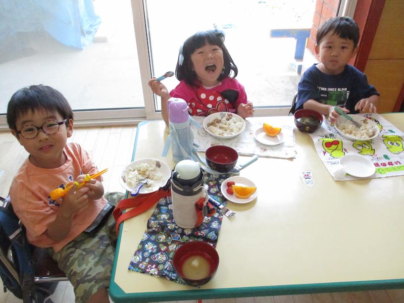 暑い日が続いていますね。暑い日でも外で遊びたいつき組さん。最近は水遊びがブームで全身びしょびしょで楽しんでいます。先日は砂場で水遊びをしました。穴を掘って水を入れて温泉にしたり、川を作ったり、丸めてお団子を作ったり、たくさん考え、たくさん体を動かして遊んでいます!遊んだ後は「おなかすいたー。」と給食をモリモリ食べる元気いっぱいのつき組です。