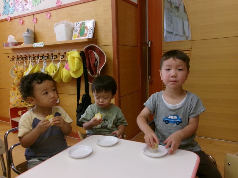十勝も収穫の秋を迎え、お兄さんお姉さんが上手に育ててくれたお芋ととうもろこしを子ども達と一緒に頂きました。お芋を洗ったり、とうもろこしの皮を順番に剥いていく中で子ども達の食べたい気持ちがどんどん高まって行きました。目の前で野菜を茹で、カットして1人ひとりに温かい茹でたての野菜が届けられると小さな可愛いお口で「ふーふー」と冷ましながら食べ、美味しい時間を過ごしました。