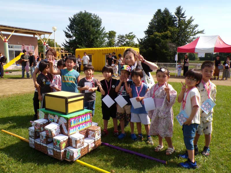 9月に入り、陽が落ちるのが随分と早くなりましたね。たいよう組は6日に行われた育成会祭りでお神輿を作り、園庭を一周してお披露目しました。今年は「マイクラ(Mine Craft)神輿」にすると話し合いで決めて製作を始めたのですが、出来上がりに大満足。「ワッショイ」の掛け声も力強く、園庭一周があっという間でしたよ。他にも出店として「ジュース屋さん」を任せてもらい、飲み物を販売。緊張や照れながらも頑張りました!この経験を10月にあるお店屋さんごっこで生かしていきたいと思います。