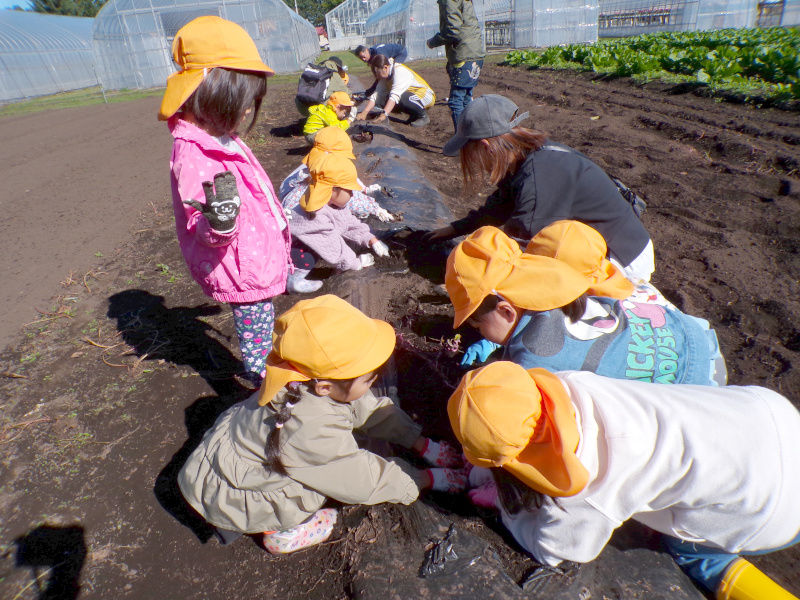今月は、音更高校へ行き、さつまいも掘りを体験しました。土の中から顔を出した大きなおいもを見つけると、「見てー!こんなに大きい!」と嬉しそうに見せ合う子どもたちの笑顔がとても印象的でした。掘ったおいもは、焼きいもにしてみんなでおいしくいただきました。