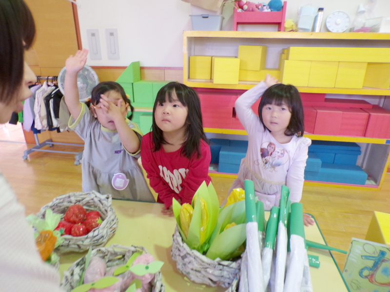 こんにちは つき組です。先日、園内でお店屋さんごっこをしました。つき組は『やおやさん』と『むしのおうち』をオープン!一つ一つ心を込めて作った商品は見る見るうちに売れていきました。「いらっしゃいませー」