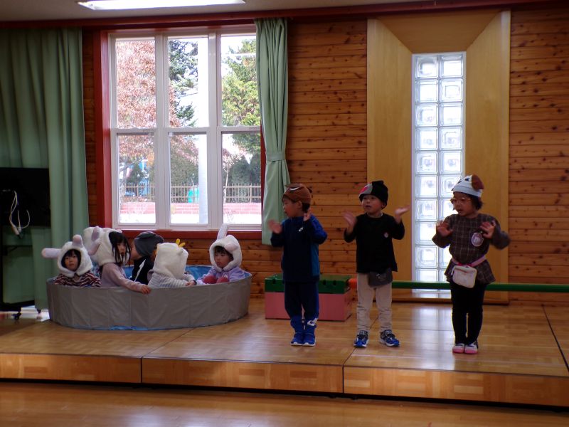 肌に触れる風もだんだんと冷たくなり、朝晩の冷え込みで水たまりに氷が張っている日があり、冬の訪れを感じますね。たいよう組は11月に入り、発表会の練習が始まりました。今年度は劇とハンドベルを行うことにしました。