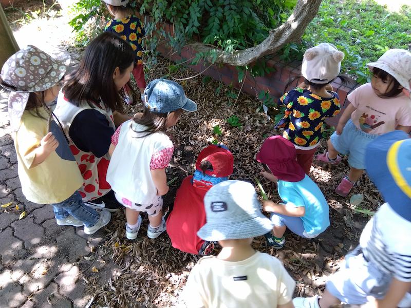 草むらやベンチの下などなど・・・ムシがいそうなところに行って探しはじめます。発見すると「せんせー いたよ!」と教えてくれます。「これ なんの ムシ??」と