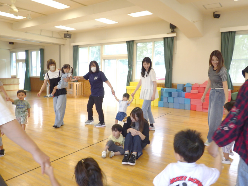中でも笑顔いっぱいだった『わらべうたあそび』では,親子で面白い顔でにらめっこをする「だるまさんだるまさん」や,ふれあい遊びの「ねずみねずみ」「おすわりやす」で楽しみました♪
