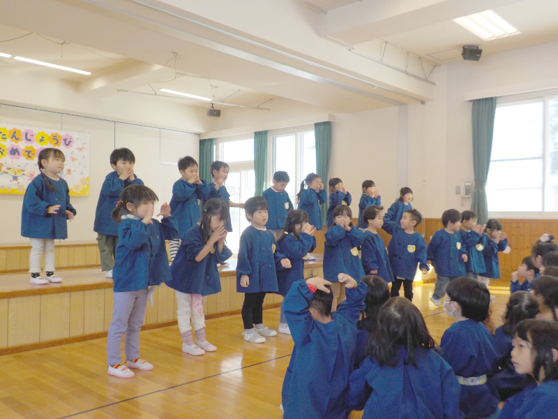 12月の誕生会ではマラカスを作り、みんなで演奏会をしました。0歳児さんと1歳児さんのマラカスづくりのお手伝いをしてまるで小さな先生のようでした!子どもたちのマラカスと先生方のタンバリンや鈴の音でとっても楽しい演奏会になりましたよ。