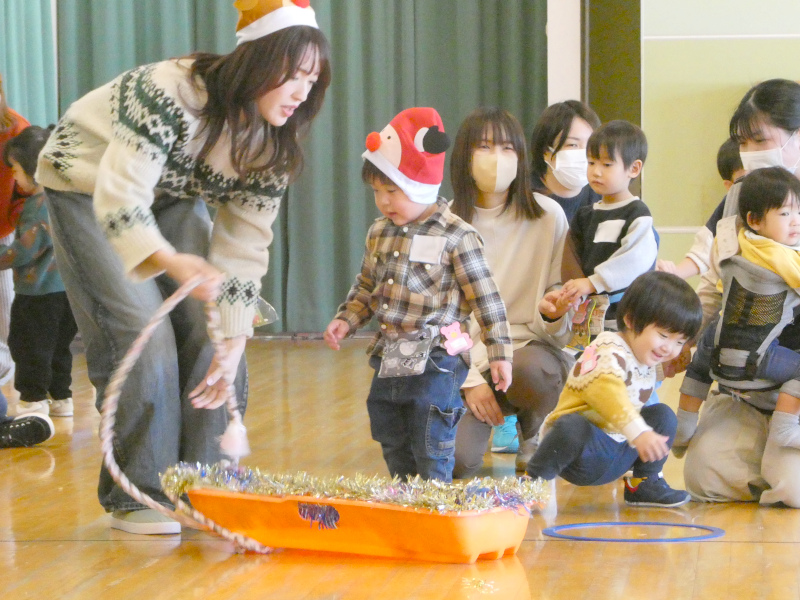 12月最後の日は,ぱちぱちルームの『クリスマス会』がありました。今日は親子でのゲームもあるので,いつもよりニコニコ笑顔で来てくれましたよ。ゲームは,親子でそりを引いたり風船のプレゼントを運んだりと,それぞれの家庭のカラーが出ていて,とてもかわいいゲームになっていました。最後には,サンタさんが来てくれ,一人ずつプレゼントを受け取りました!サンタさんの顔を見ながらありがとうが言えたぱちぱちさんのステキな姿が見ることが出来ました。これから長い冬休みになってしまいますが,みんな元気でまた1月に元気で会いましょうね。