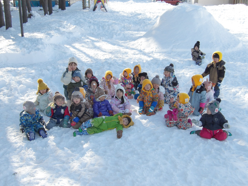 12月になりやっと雪が降り、子どもたちも大喜びです。大好きな雪が降ったので難しいつなぎや手袋を履いたりするのも頑張っています。「お家で(雪かき)お手伝いしたんだ〜」と報告していてとっても可愛らしいですよ。雪合戦をしたり、バケツを使ってケーキを作ったりと冬の遊びを全身使って楽しんでいます。