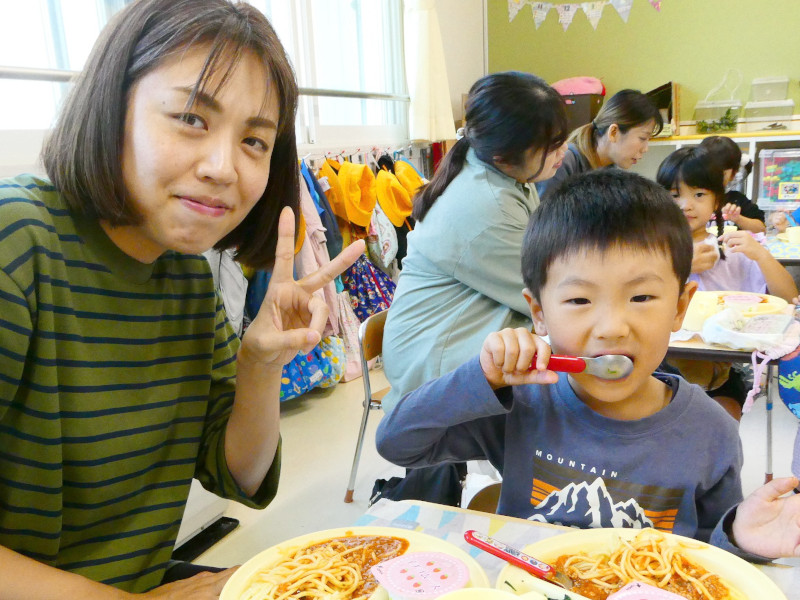 誕生会後は,9月生まれさんの給食試食会を行いました。「牛乳」「なすミートスパゲティ」「ほうれん草コーン炒め」「いちごムース」の栄養たっぷり,バランスばっちりな美味しい給食を親子で楽しみながら,和やかに誕生会&試食会は終了しました。