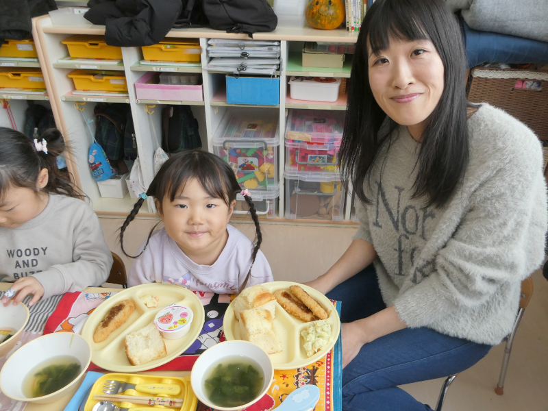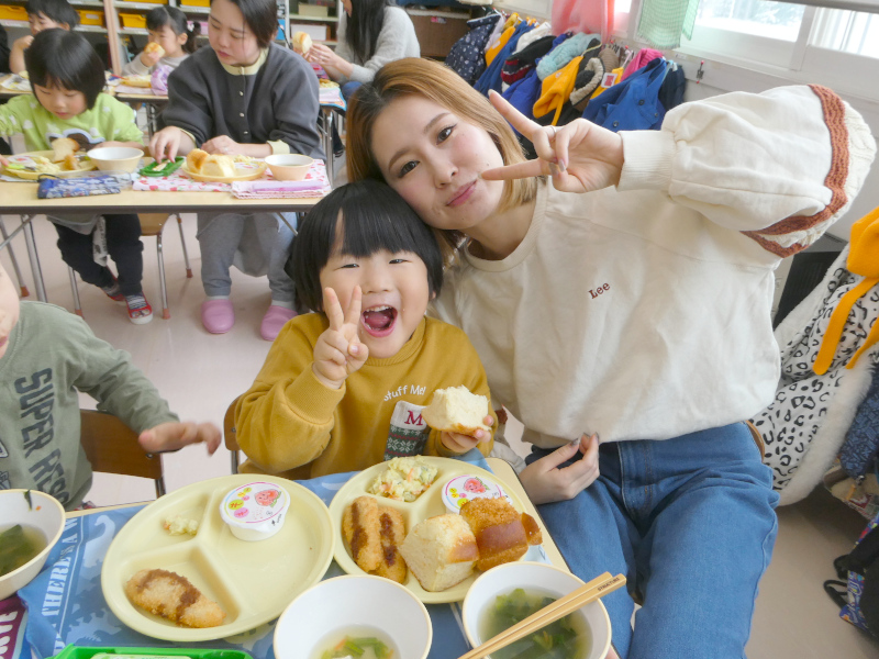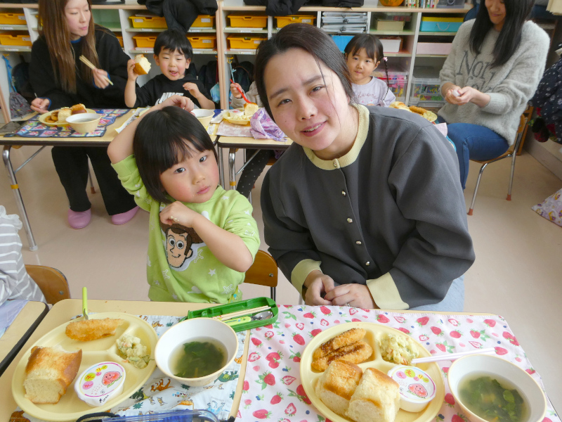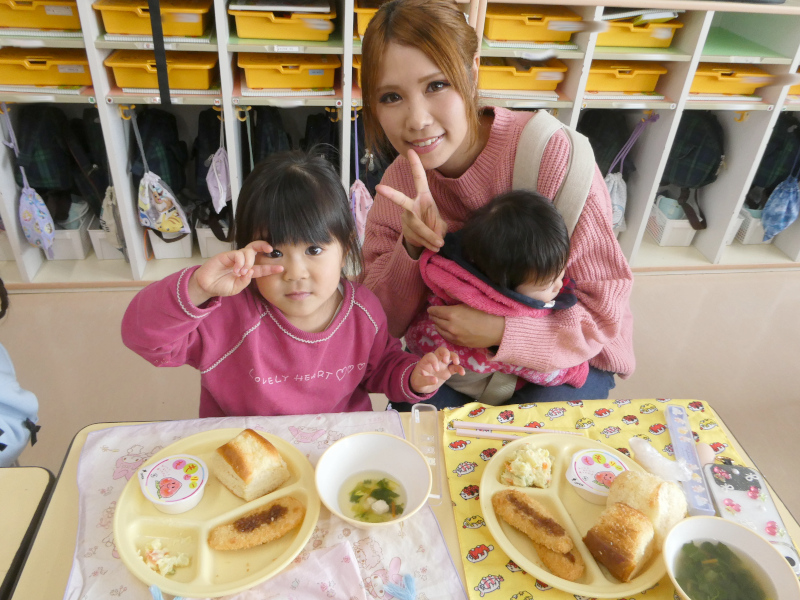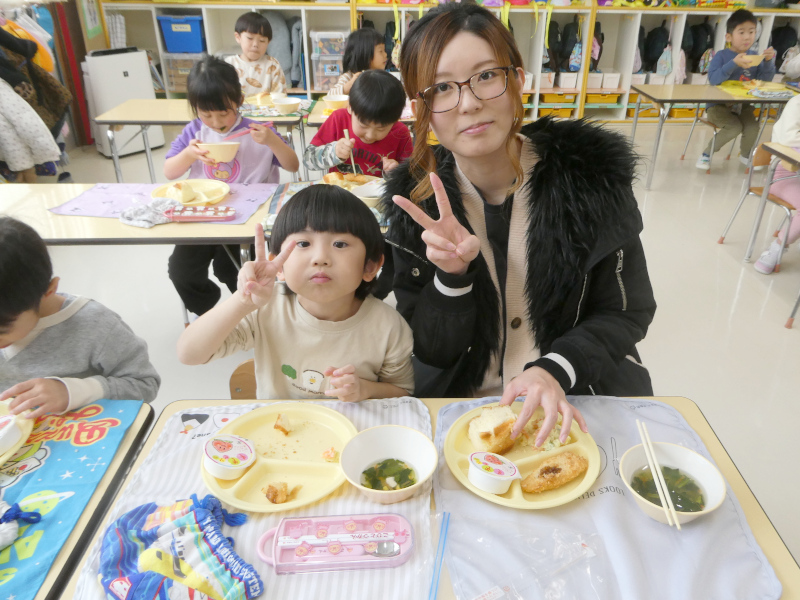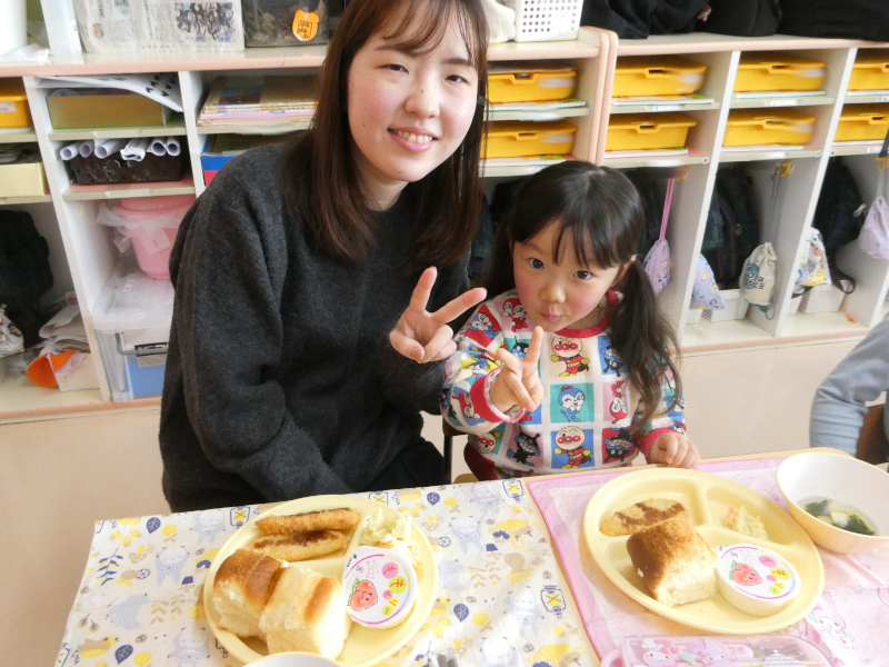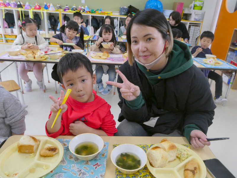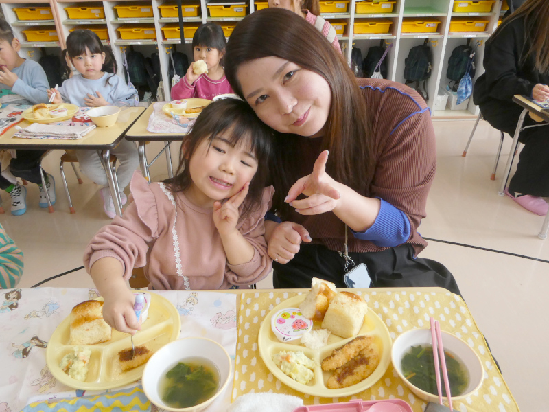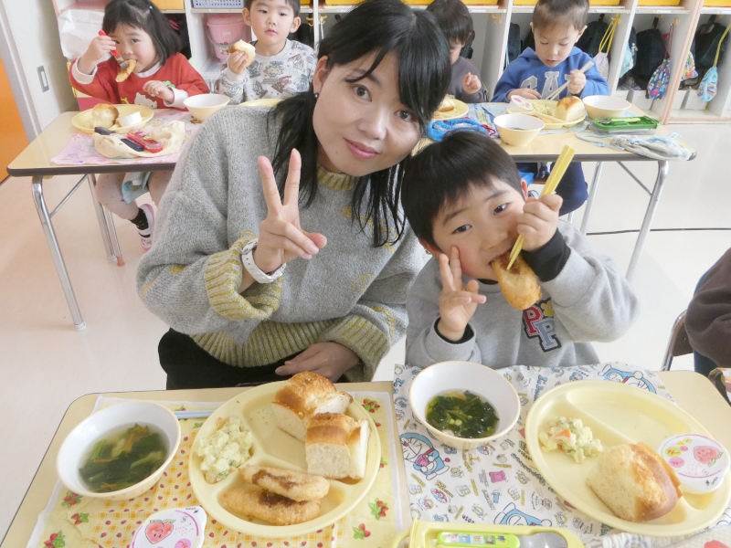 1月29日に1月生まれの誕生会を行いました。誕生会は、幼稚園行事の特別な日です。1月は、1年のはじまりの月。足跡のない新雪のようなまっさらの月。今年はこんなことしたいなとか、こんなことがんばろうとか、夢や希望が広がる月です。こんなはじまりの月に生まれた1月生まれのお友達は、ご家族の皆さんにとって、1番の希望になったことでしょう。1月生まれさんを園のみんなでお祝いしました。はじめに、誕生日を迎えたお友達は、ステージの上で、『組・名前・○歳になりました!』と発表し、将来の夢(年長)や好きな遊び(年中)、好きな食べ物(年少)をお話ししてみんなからたくさん拍手をもらいました。それから、みんなでHappy Birthdayの歌でお祝いし,もり組からの出し物,Snow Manの「カリスマックス」の,かっこいいダンスに釘付けになりました。園からはバースデイカードをプレゼントしました。 誕生会後は、1月生まれさんの給食試食会を行いました。「ベビーパン」「ほうれんそうのスープ」「ささみチーズフライ」「さつまいもサラダ」「ももゼリー」の栄養たっぷり、バランスばっちりな美味しい給食を親子で楽しみながら、和やかに誕生会&試食会は終了しました。参加いただいた保護者の皆様、ありがとうございました!