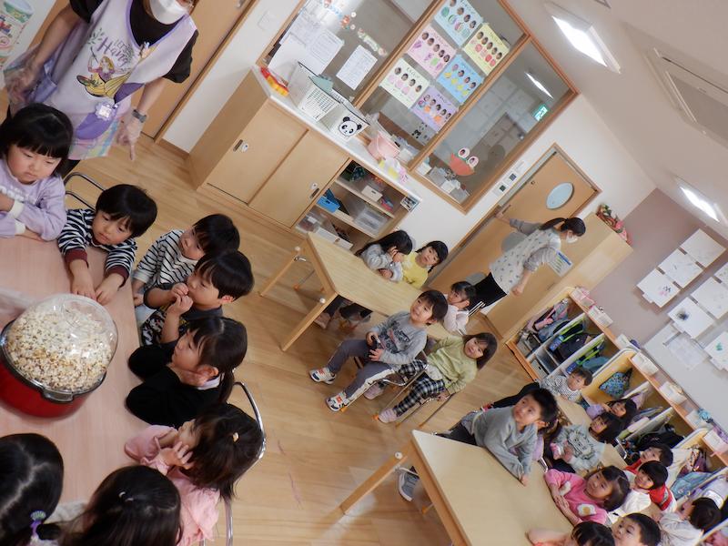 こんにちは!ぱんだ組です。12月には発表会が行われ、大成功で終われたぱんださん。大きな自信に繋がりましたよ。さて、今月で2学期が終了。夏・秋・冬と3つの季節を過ごした2学期は、お友達との関わりが少しずつ増え、ごっこ遊びが大流行でした。特に発表会練習時期は、他の学年の発表会の真似をしたりと大盛り上がり。楽しみにしていたポップコーンパーティーもでき、充実した2学期を過ごせました。3学期も元気いっぱい笑顔いっぱい楽しみます。よいお年を。