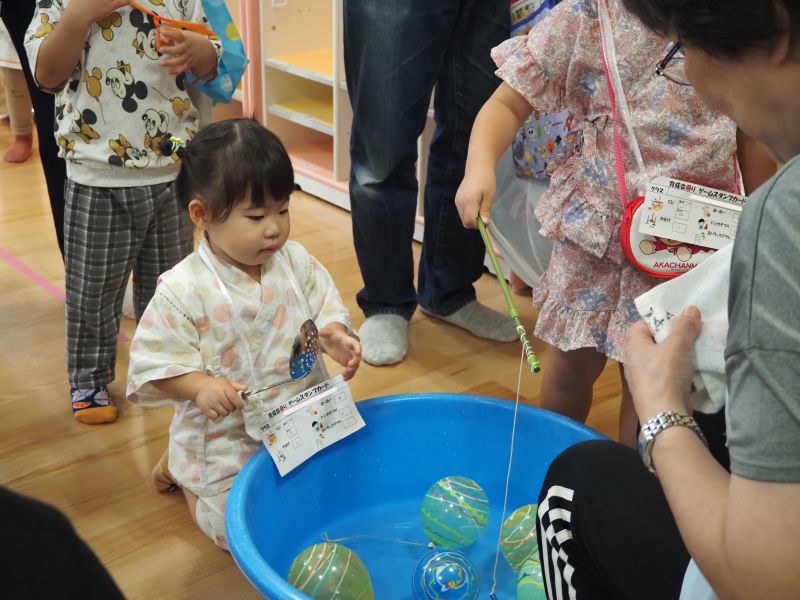 園舎内へ移動して催し物のブースを親子で楽しみました。いつもとは違うこども園のお祭りの雰囲気に笑顔いっぱい!お家の方やお友だちと飲み物を飲んだり、おにぎりを食べたり、あちこちでかわいい笑顔がたくさん見られました。