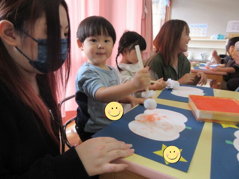今回は、こども園のうさぎ組(2歳児クラス)にお邪魔してきましたよ。まずは制作・・・スタンプでかぼちゃに色付けしたり、飾りをのりで好きなように貼り、とってもかわいいハロウィン制作になりました!
