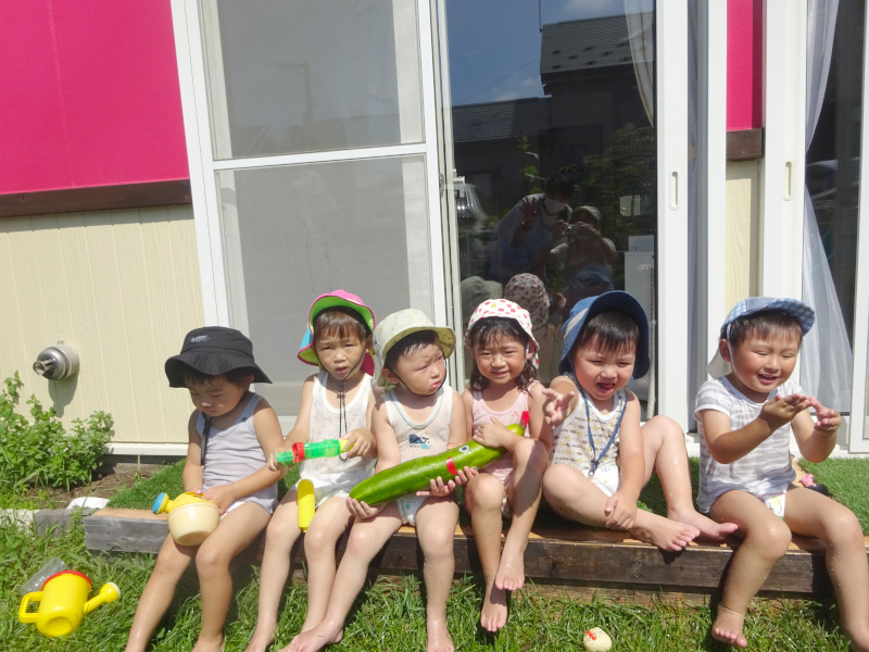 暑い日が続いています。この夏は、水遊びをいっぱいしました。たらいに入れた水を汲んで、水でっぽうをしたり、ジョウロでジャージャーしたり、クラスの畑に水やりもしました。おかげで畑のきゅうりは大、大、大豊作でした。毎日お散歩や水遊びの前に、きゅうりやトマトの様子を見て「きゅうりあった〜!」「トマト取りたい。」と子どもたちは収穫をとても楽しみにしていました。ひとつだけきゅうりを大きく育ててみました!長さは44センチ、重さは1.4キロととても大きく育ち、「おっきい〜!!」とみんなびっくりです!