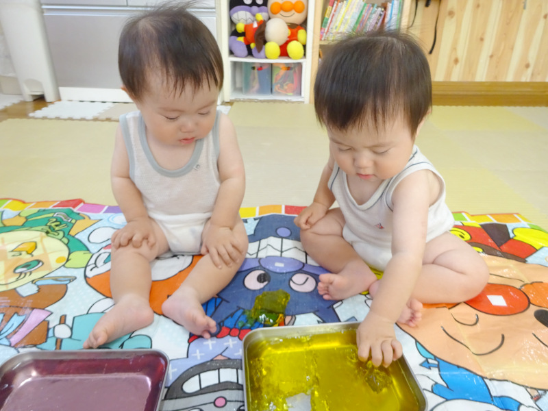 七夕は出し物など真剣に見ている様子があり、ゼラチンや絵の具では手を伸ばして触ってみたり、触ってみたけどやっぱり怖くて泣いてしまったりとたくさんの体験をしたすもも組さん!最近は、ハイハイで移動する姿もよく見かけるようになり、つかまり立ちも出来るようになって、ますます目が離せなくなってきました。これからの成長もとっても楽しみです☆