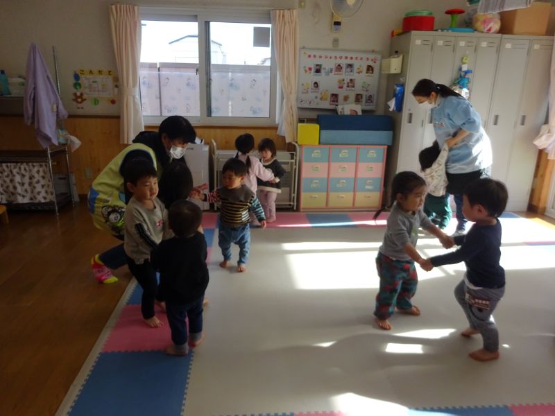 最近は、二人で手をつないでするリズムや歌遊びを楽しめるようになってきました。音楽が聞こえてくるとニヤニヤしながらお友だちを探して手を繋いでいます。全員での写真としてはっぴょうかいごっこの総練習の写真でクラス紹介しますね。冬の寒さを感じるようになりましたが、12月も戸外遊びを楽しみながら楽しく過ごし、9人の温もりの中で元気に暖かく過ごしていきましょう!