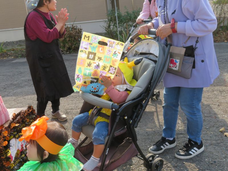 事前に依頼していた方々のお家やお店へ行き、「トリックオアトリート!」と大きな声で言ってお菓子を貰いました!お礼に「ハロウィンのうた」をプレゼントし、歌い盛り上がりました。沢山お菓子をもらい、子ども達はとっても嬉しそうでしたよ。