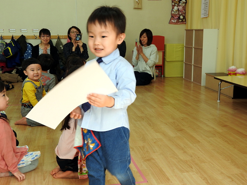 先日は、大根抜きや椅子取りゲーム、ボールを渡す爆弾ゲームも行いました。「椅子の近くを歩くんだよ」と伝えると少しずつですが歩けるように。「真ん中には入れないよ」と最初に伝えたので中に入る子はいませんでした。そうやって少しずつルールを理解しています。