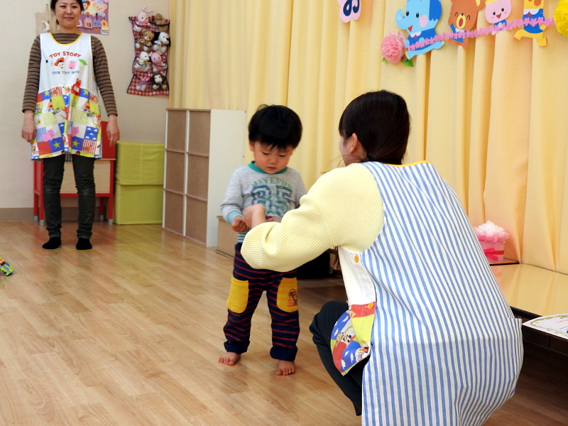 月齢の低い子も最近では沢山お話してくれる子が増え、自分の意思を伝えようと頑張っているぴよぴよさん。「いっしょにあそぼう!」と声を掛けたり、「うん」と答えたり、お友だちとの関りも増えてきています。