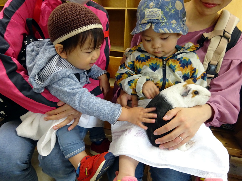 ふれあい広場へ移動し、お母さんやお父さんのお膝の上に座り、モルモットをお子さんのお膝の上へ。「かわいい〜」「ふわふわだね〜」と喜んでいる子や、ちょっと大きくてびっくりしていた子も。。。 たくさんたくさん小さなおててで撫で、ふれあいを楽しんできました。