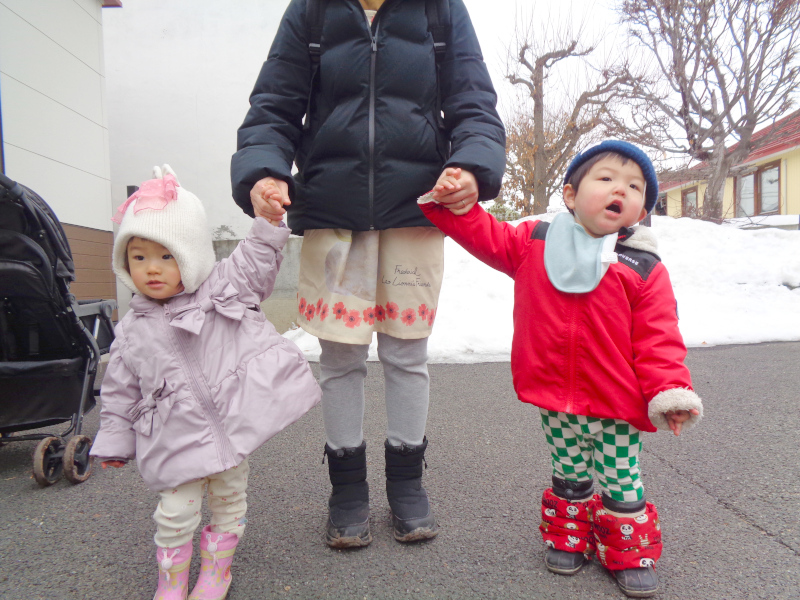 雪解けが一気に進み、春のぽかぽか陽気にお外へ出るのがより一層楽しみな季節となりました。お気に入りの石を拾ったり、福寿草の花を不思議そうに見つめたりしながら楽しくお散歩をしています♪雪が降る前にはベビーカーでお散歩をしていたお友達も、今では靴を履いて手を繋いでお散歩を楽しめるようになりました。一生懸命歩く姿に成長を感じる今日この頃です。