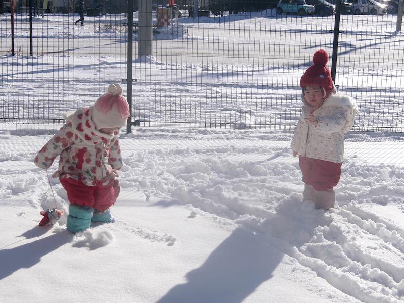 園庭にも雪が積もり、いよいよ本格的な冬がやってきました。真っ白な景色に目を丸くしたり、手を伸ばして雪を触ってみたりと、子ども達は冬ならではの世界を楽しんでいます。