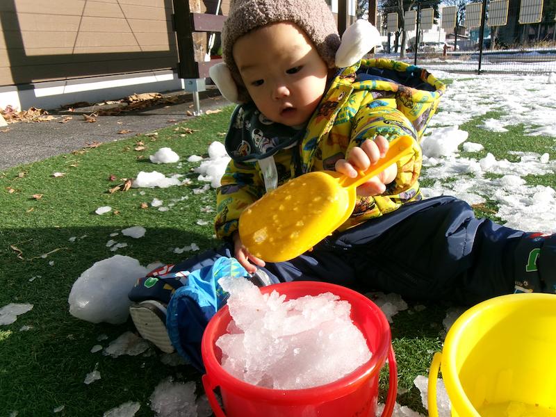 12月に入りすぐ子どものたちの大好きな雪が降り、早速つなぎを着て雪遊びをしました。最初は上手く立てないもどかしさと動きにくさに苦戦していましたが、2日目にはスタスタと歩けるようになり、時には自分で手袋を取り素手で雪を触ったり、氷を集めたり、投げてみたり雪遊びを満喫しているようです。