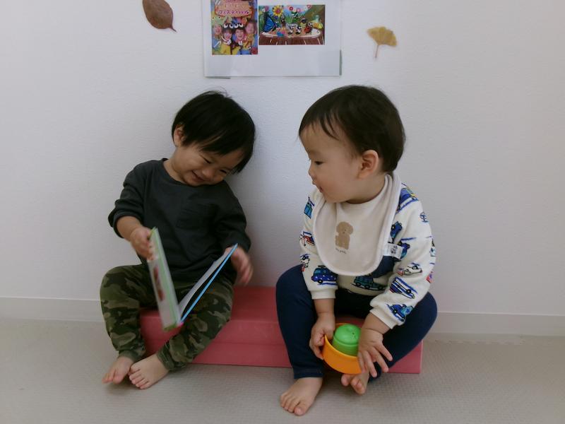 クラスのお友だちの存在を気にするようになり、名前を聞くと指を差したり、玩具を渡したり、くっついて絵本を見たりと2人が揃うことが増え、可愛さがパワーアップしています。