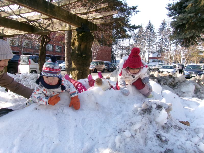 新しい年が始まり、子ども達の元気な声をとともに園での生活も再スタートしました。本年も一人ひとりの成長を大切にしながら、楽しく過ごしていきたいと思います。どうぞよろしくお願いいたします。1月は寒さが厳しく、園庭の雪が凍っていたりお散歩が滑りやすくなったりしていて、外遊びができない日も多くありました。そんな日は、らっぱ組で人気のシール貼りや風船あそび、サーキットあそびなどを楽しみました。指先を使って集中したり、体動かして思いきり遊んだりと、室内でも笑顔いっぱいで過ごしています。戸外に出た日は、スコップを手に雪遊びを楽しみました。雪をすくったり、山を登り降りしたりと冬ならではの遊びを満喫する子どもたち。冷たい雪の感触や雪道にも少しずつ慣れ、たくましさも感じられるようになってきました。寒い日が続きますが、体調管理に気を配りながら、これからも冬の遊びを楽しんでいきたいと思います。