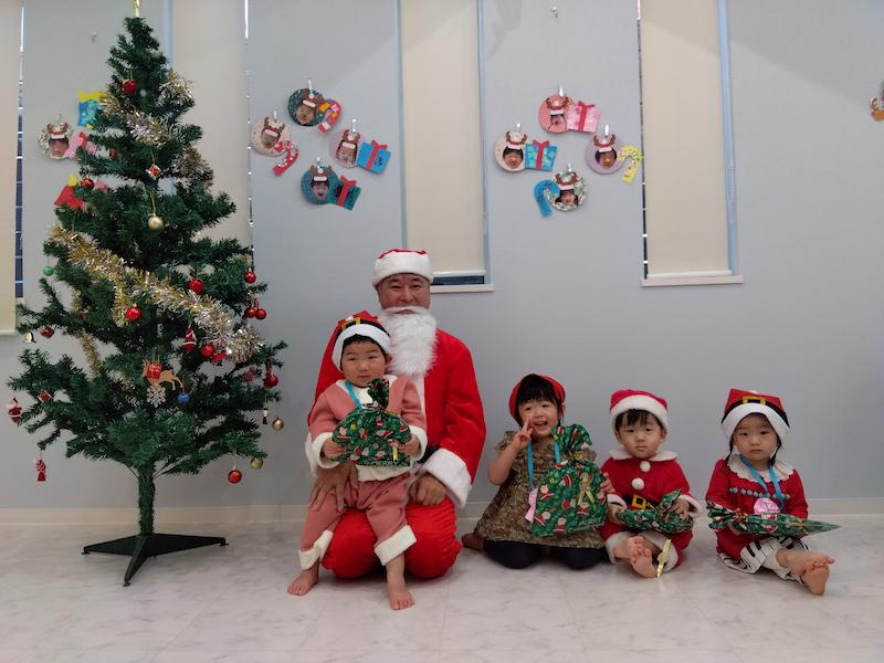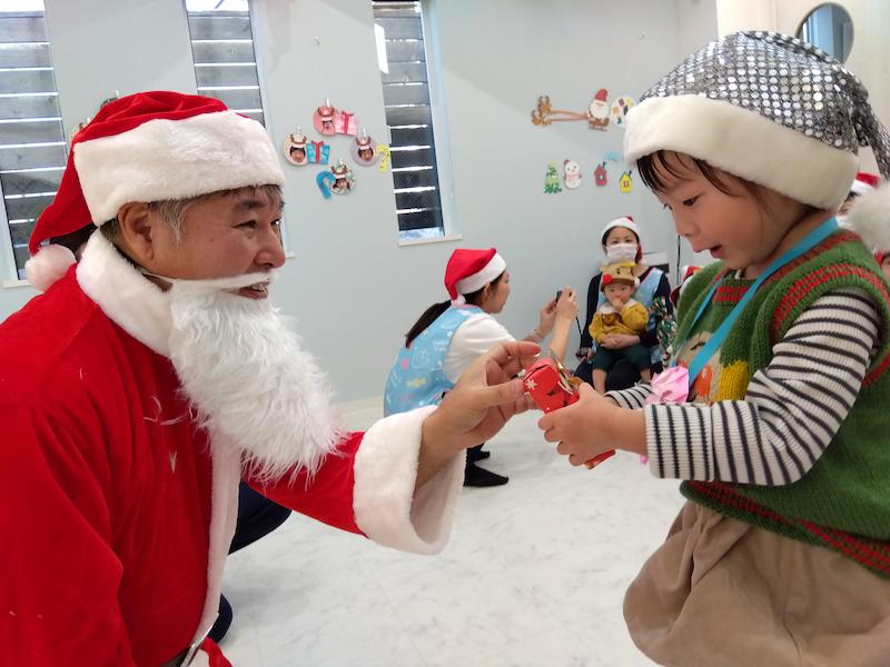 心待ちにしていたサンタさんの登場では、遠くからシャンシャンシャンシャンと鈴の音が聞こえ、大きな袋を持った愉快なサンタさんが現れると固まる子どもたち。突然の登場に驚きながらも、1人ずつプレセントをもらい、たいこ組さんが考えた「好きな食べ物」と「好きな色」を聞き、答えてもらうと「ケーキすきなんだって〜!!」「ショートケーキかな?」と嬉しそうでした。また来年も来てくれますように…メリークリスマス!