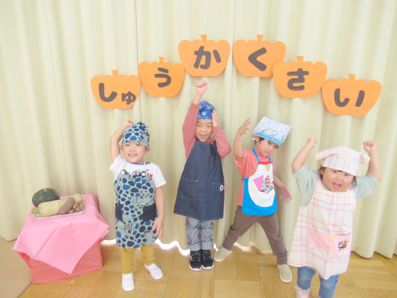 19日(水)は収穫祭がありました。保育所の農園で春に植え、育て、秋に収穫したじゃがいも、人参、大根、かぼちゃ、枝豆を使って、豚汁、かぼちゃグラタン、ノーザンルビーのポテトサラダを作りました。野菜を切ったり、混ぜたり、自分たちで育てた野菜を料理するのはとても楽しそうでした。食べる時には、お父さん・お母さんが来て一緒に食べてお父さん達から「おいしいよ」と言われ、とても嬉しそうでした。
