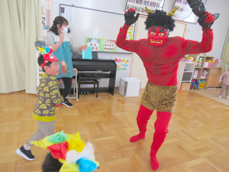 ドキドキしている子ども達。作った鬼のお面をつけて、オニのパンツの歌を歌っていると、鬼がやってきました。子ども達は「おにはそとー!ふくはうちー!」と豆を投げ退治しましたが、もう鬼が来ないようにとみんなで