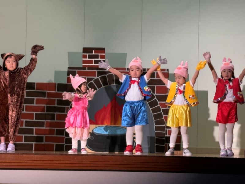 11/15(土)発表会がありました!小学校との合同発表会に参加しました。保育所の演目は「お遊戯」と「劇」の2つです。遊戯は「恋のダイヤル6700」。音楽に合わせてリズミカルに踊っている5名の子どもたち。特にお尻フリフリはノリノリでとっても可愛いかったですよ。劇「3匹のこぶた」は配役がちょうど5名で、お母さんぶた役は未満児さん。出番もセリフに合わせた振りもバッチリでお母さんぶたになりきっていました。3匹のこぶたがオオカミと奮闘する演技もしっかりできましたよ!年中、年少、未満児合わせて5名の子ども達は歌も披露して大勢の人が見ている前で頑張りました。