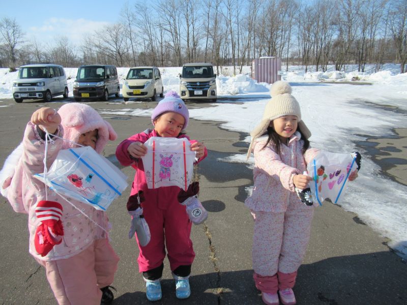 保育所裏に造られた雪山でそり遊びをしました。とても良い天気で寒さに負けず雪遊びができましたよ!バケツに雪を詰めて次の日にはこの雪がどうなっているのか実験しよう!と張り切って雪を沢山詰めている子ども達。しばらくしてからバケツをひっくり返すときれいな氷ができていて「出来た〜すご〜い」と大喜びでもう一度氷を作る!と雪集めに精を出していました。