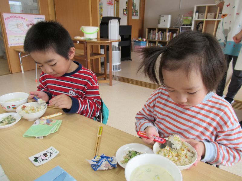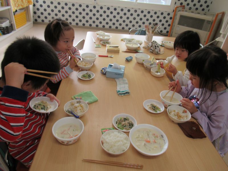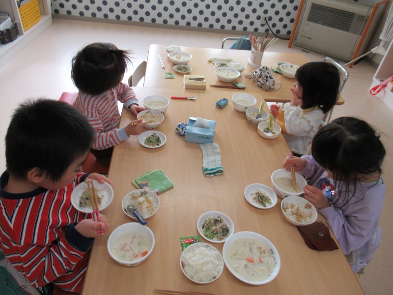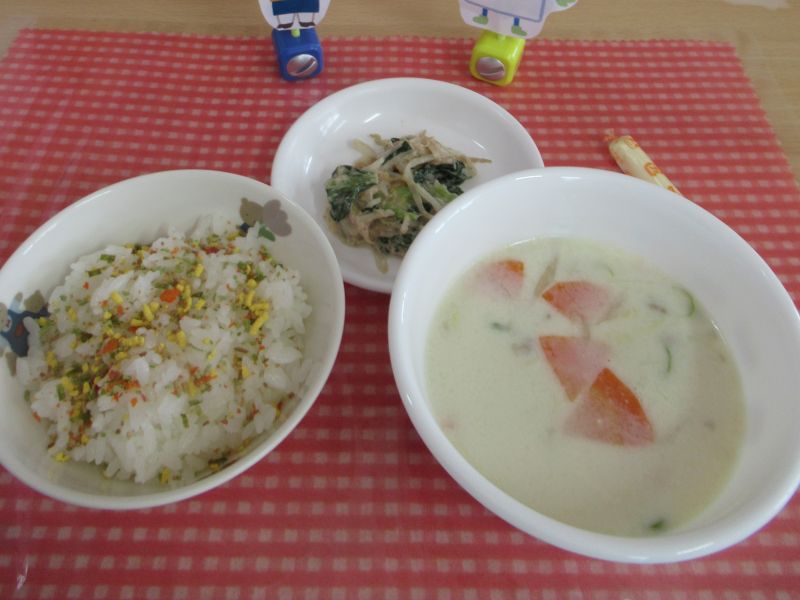 今年の給食はミルクたっぷりの「ミルク豚汁」で,子どもたちは満面の笑顔,あっという間にお椀が空になった子もたくさんいましたよ。また,お楽しみのおやつは「牛乳みかんゼリー」で,乳製品をたっぷり楽しんだ一日になりました。