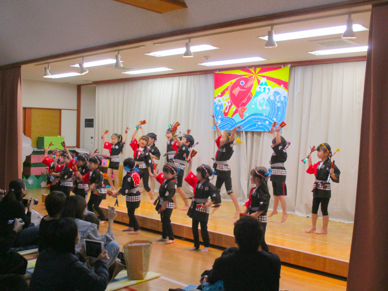 11月19日、発表会がありました。皆で声をそろえて歌った合唱。クラス全員での劇あそび“もりのおふろ”。年少さんだけで頑張って練習し、可愛らしく歌い踊った“メロンパンパン”の表現あそびに、年中さんのかっこいい“よさこい”。