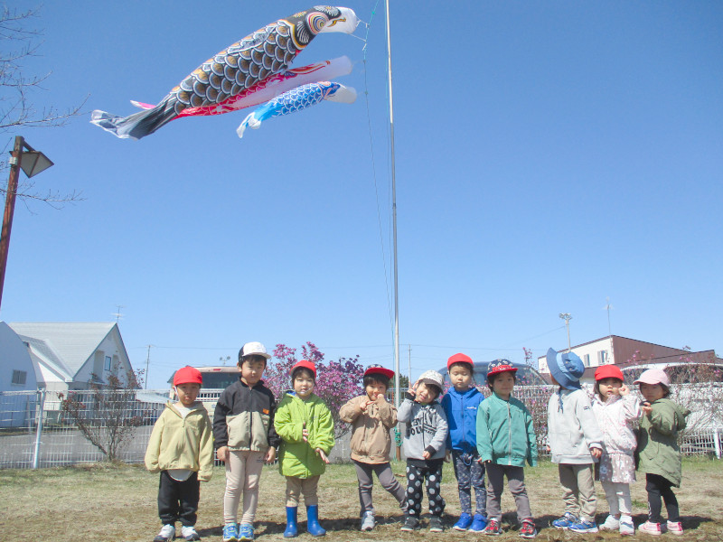 先日のこいのぼり製作では、ハサミやのりを上手に使用していました。画用紙を交互に編んでいく作業も最初は苦戦していたのですが、続けていくうちに上達していました。園庭にもこいのぼりが飾られたので記念に写真も撮りましたよ✨
