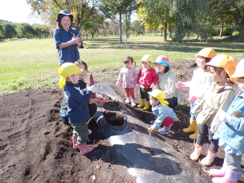 今月は、音更高校へ行き、さつまいも掘りを体験しました。土の中から顔を出した大きなおいもを見つけると、「見てー!こんなに大きい!」と嬉しそうに見せ合う子どもたちの笑顔がとても印象的でした。掘ったおいもは、焼きいもにしてみんなでおいしくいただきました。