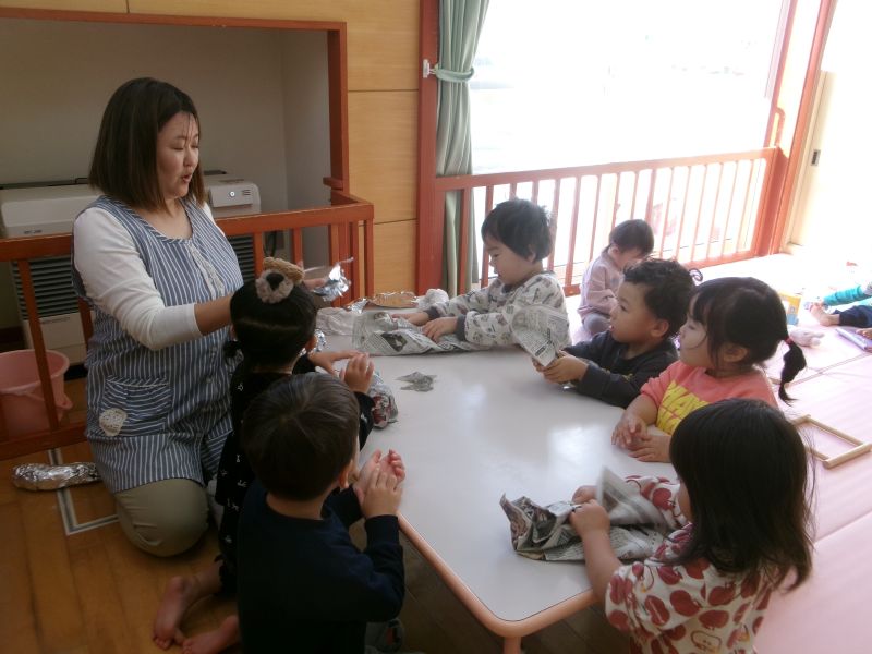 音更高校で掘り当てたさつま芋を使って、やきいも大会をしました。お芋を洗ってペーパータオル⇒新聞⇒アルミホイルと次々に巻いていきます。子ども達は夢中になって上手に包んでくれました。外の焼き台に入れて、遊んでいるうちに良い香り・・・焼きたてのお芋のきれいな色にビックリ!ふーふーと冷ましながら美味しく頂きました。秋空の下、みんなで食べる焼き芋は格別、心まで温まる時間を過ごしています。