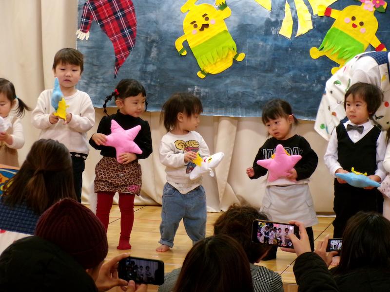 11月29日に発表会がありました。本番ではいつもと違う雰囲気にちょっぴりドキドキした子ども達でしたが、いつもお部屋で行う聞き馴染みのあるピアノの音や曲が聴こえてくると笑顔が溢れ堂々と発表している姿が素敵でしたね。0歳さん2名によるステージ、1・2歳さん12名によるステージ、どちらも“大好きな家族が見てくれている”その気持ちが子ども達1人ひとりを輝かせたのだと感じています。沢山の拍手や応援、本当にありがとうがざいました。