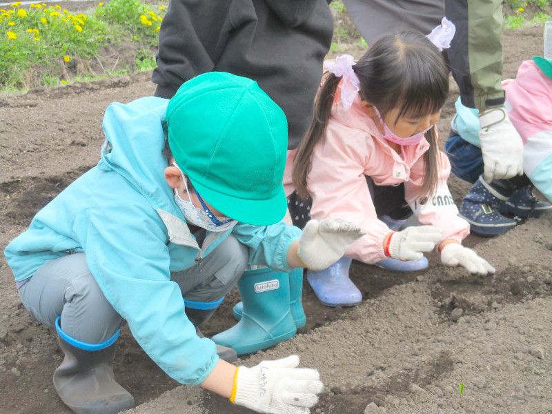 次はトウモロコシの畑に行き、赤い色の種を一粒ずつ埋めました。最後はじゃがいもです。おじさんや先生のお話をしっかり聞いて、みんなで種いもを持って決まった場所に植え、土の感触を楽しみながら「大きくなあれ」と土のお布団をかけてあげましたよ。