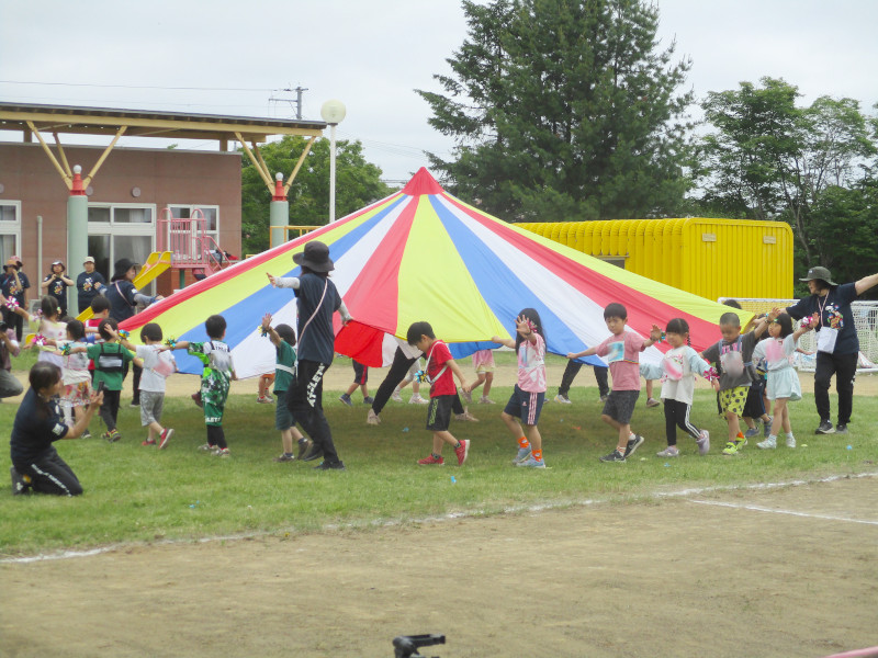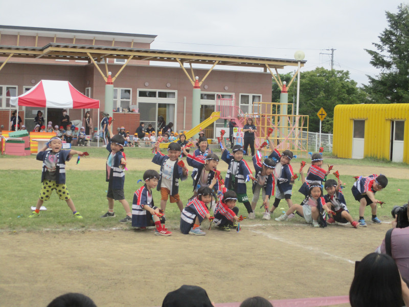 未満児ほし組さんは、親子遊戯で大好きな家族と一緒にわらべうたを楽しみました。年少にじ組さんは、ポンポンを持って可愛らしいお遊戯を披露してくれました。年中つき組さんはフラッグと、年長さんと一緒にバルーンにも挑戦‼たいよう組さんは竹登り、バルーン、ヨサコイと年長さんらしい逞しい姿を見せてくれました。